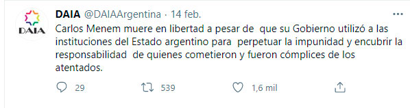 Menem también era el mismo hombre a quien la DAIA, representación de la comunidad judía argentina, expresó tras su muerte que durante su presidencia se produjeron los dos atentados terroristas más graves de la historia argentina.