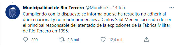 Pero Menem también era –o sería- el mismo hombre que tras su fallecimiento obtendría el repudio y la no adhesión al duelo nacional de la Municipalidad de Río Tercero. Marcos Ferrer, intendente de la localidad cordobesa, ya el 3 de noviembre de 2020 -25 aniversario de las explosiones de la Fábrica Militar- había firmado el Decreto 638/2020 declarándolo persona no grata.