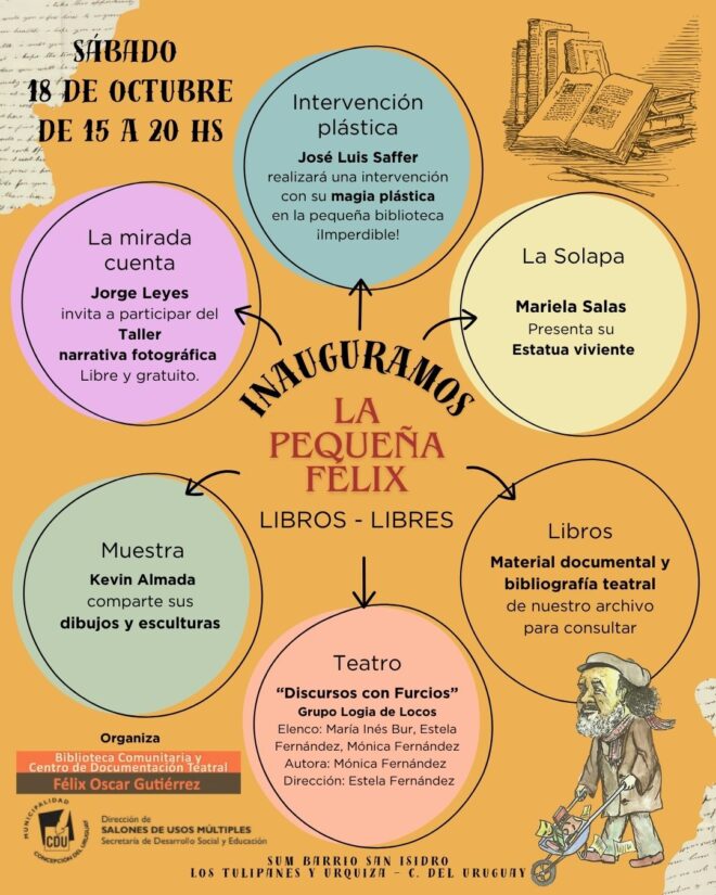 La Biblioteca Comunitaria y Centro de Documentación Teatral Félix Oscar Gutiérrez de Concepción del Uruguay organiza el 18 de octubre una jornada cultural abierta a la comunidad conmemorando el natalicio del referente teatral Félix Gutiérrez, nacido en esta ciudad el 14 de octubre de 1948, encendiendo en esta acción la memoria de quienes han dedicado su vida a la labor cultural sobre todo en este barrio.