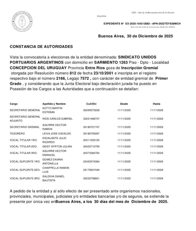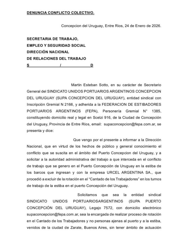Y luego informaron que "el SUPA Concepción del Uruguay, conducido por su Secretario General Martín Soto, goza de inscripción gremial otorgada por Resolución N° 812, inscripta bajo el Registro N° 2166, Legajo 7572, con carácter de entidad gremial de primer grado, lo que le otorga plena legitimidad para representar a los trabajadores del puerto".