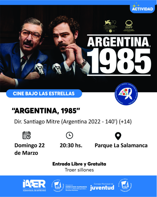 El domingo 22 de marzo a las 20.30 se realizará una nueva edición del ciclo “Cine Bajo las Estrellas” en el Parque La Salamanca, donde se proyectará la película “Argentina, 1985”. La actividad será con entrada libre y gratuita, y se recomienda a los asistentes llevar reposera o manta para mayor comodidad.