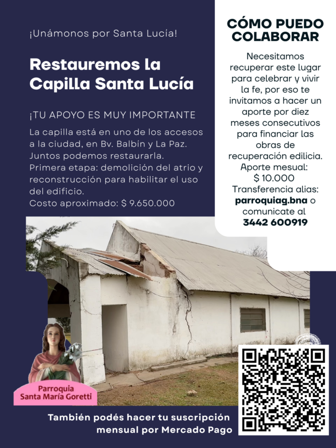 La parroquia Santa María Goretti tiene en marcha una campaña de recaudación de fondos para la restauración de la capilla Santa Lucía ubicada en el acceso de la ciudad por Bulevard Balbín.