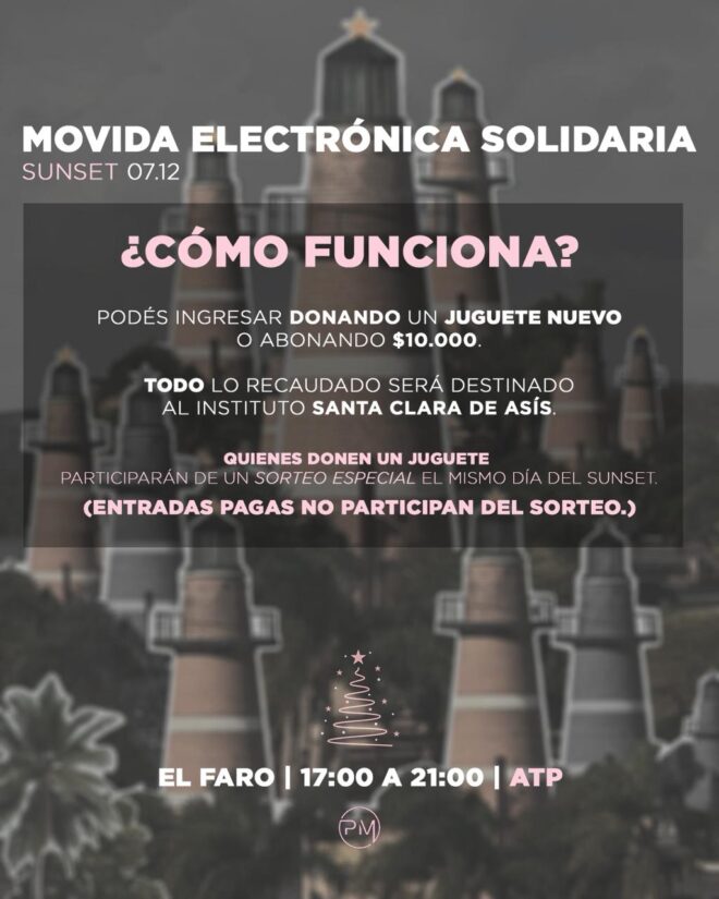 "PM Producciones" presenta la realización de un Sunset Solidario con el fin de acompañar y brindar apoyo a la comunidad en estas fechas tan sensibles. El encuentro se llevará a cabo en El Faro (Jordana y Defensa Sur), este domingo 7 de diciembre desde las 17, y será un espacio abierto a todas las edades, con música, barra y la posibilidad de compartir mates y algo rico entre amigos y familia. La entrada será la donación de un juguete nuevo, que luego será entregado al Instituto Santa Clara de Asís. Cada juguete donado permitirá que un niño reciba un regalo en estas fiestas.