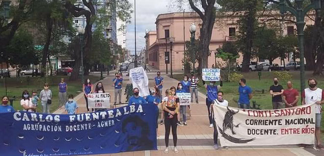 “En el marco de la Jornada Nacional de Lucha Docente convocada para hoy por los sindicatos provinciales, seccionales y minorías combativas, y de las 72 horas de paro definidas para esta semana en nuestra provincia, desde la CDD Agmer Uruguay por la Fuentealba le dimos carácter activo concentrándonos en plaza Ramírez. Allí, denunciamos el intento de imponer una presencialidad forzada por parte del gobierno nacional y los provinciales, al tiempo que denunciamos el fuerte ajuste educativo que representa el presupuesto 2021 votado hace unos días. Un presupuesto de ajuste, a la medida del FMI, que tiene su máxima expresión en la fuerte caída de los salarios consumada con las paritarias a la baja”, indicaron a este medio.
