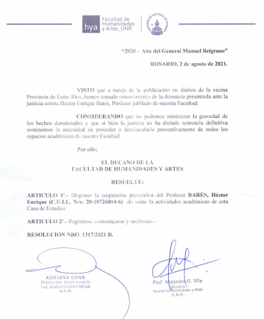 La resolución que tiene la firma del decano de la Facultad de Humanidades y Artes de la UNR, Alejandro G. Vila y la Directora General de Administración, Adriana Dana, resolvió “Disponer la suspensión preventiva del profesor Barés, Héctor Enrique, de todas las actividades académicas de esta Casa de Estudios”.