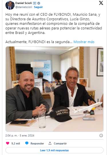 Un paréntesis sobre la expansión de la aerolínea low cost que apareció en el país durante el gobierno de Mauricio Macri. Hay chances de que sumen rutas a Brasil. Por eso se reunieron con el embajador en ese país Daniel Scioli, ex precandidato a presidente por Unión por la Patria. Ex todo, bah. Es impresionante la foto que subió a redes el Pichichi, con gorra de “Las fuerzas del cielo” y foto de él con Milei detrás. Nada. Cierro paréntesis.