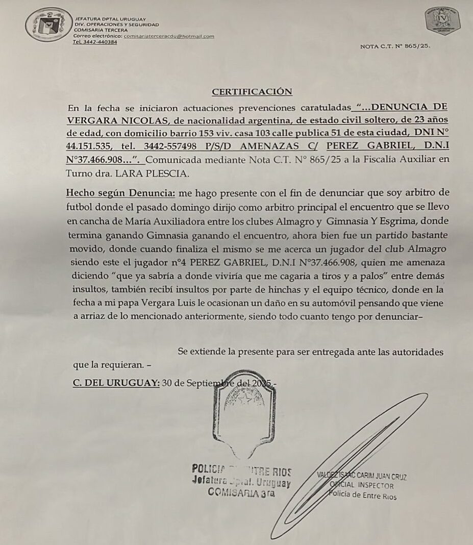 El árbitro ratificó a EL MIÉRCOLES lo que denunció antes en la Comisaría Tercera de la Policía: “Fue un partido bastante movido. Cuando terminó, se me acercó el jugador Gabriel Pérez y me amenazó, diciéndome que sabía dónde vivía y que me cagaría a tiros y a palos”. Además, agregó que recibió insultos por parte de hinchas y equipo técnico de Almagro.